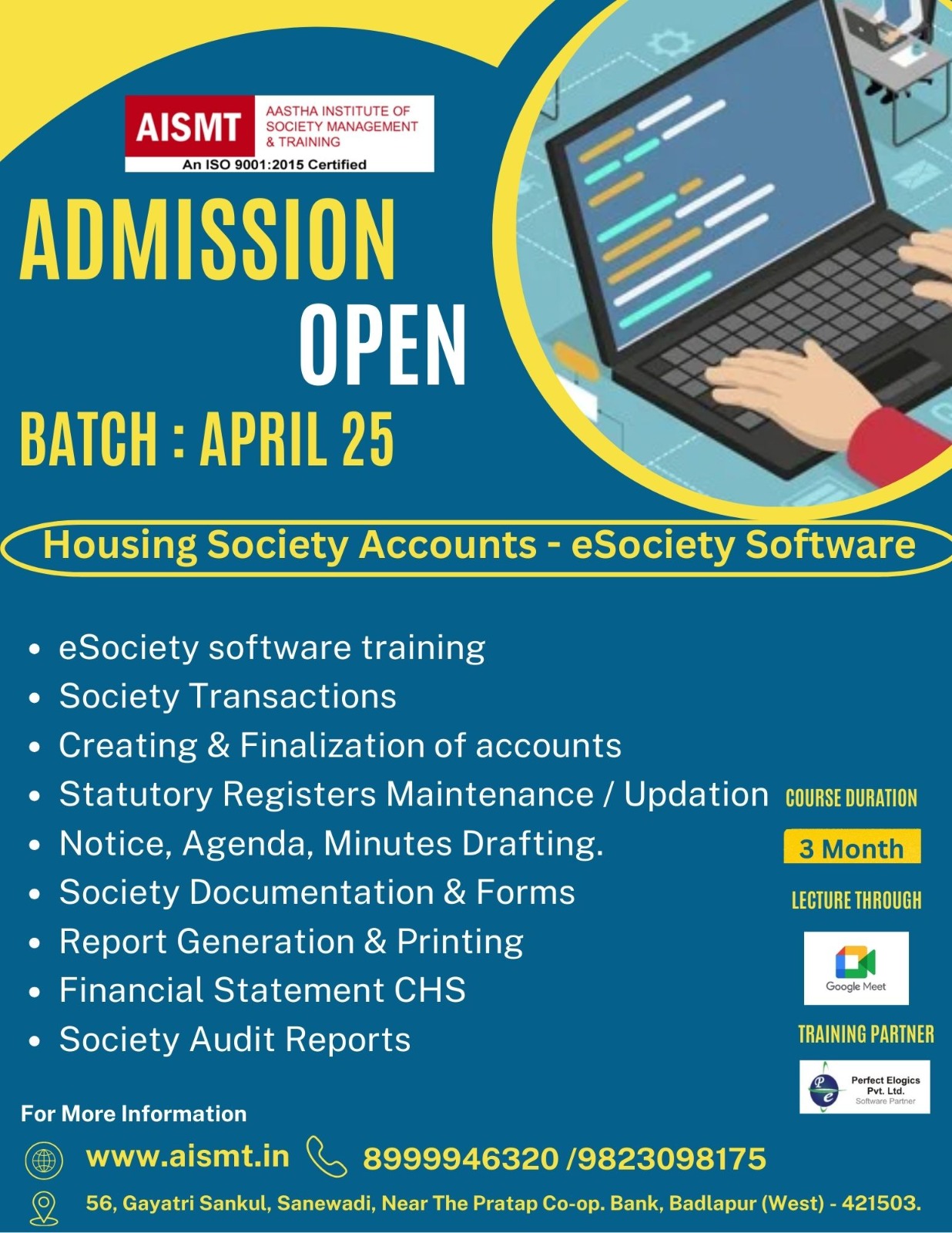Eligibility: 12th Pass/ Society Work Experience